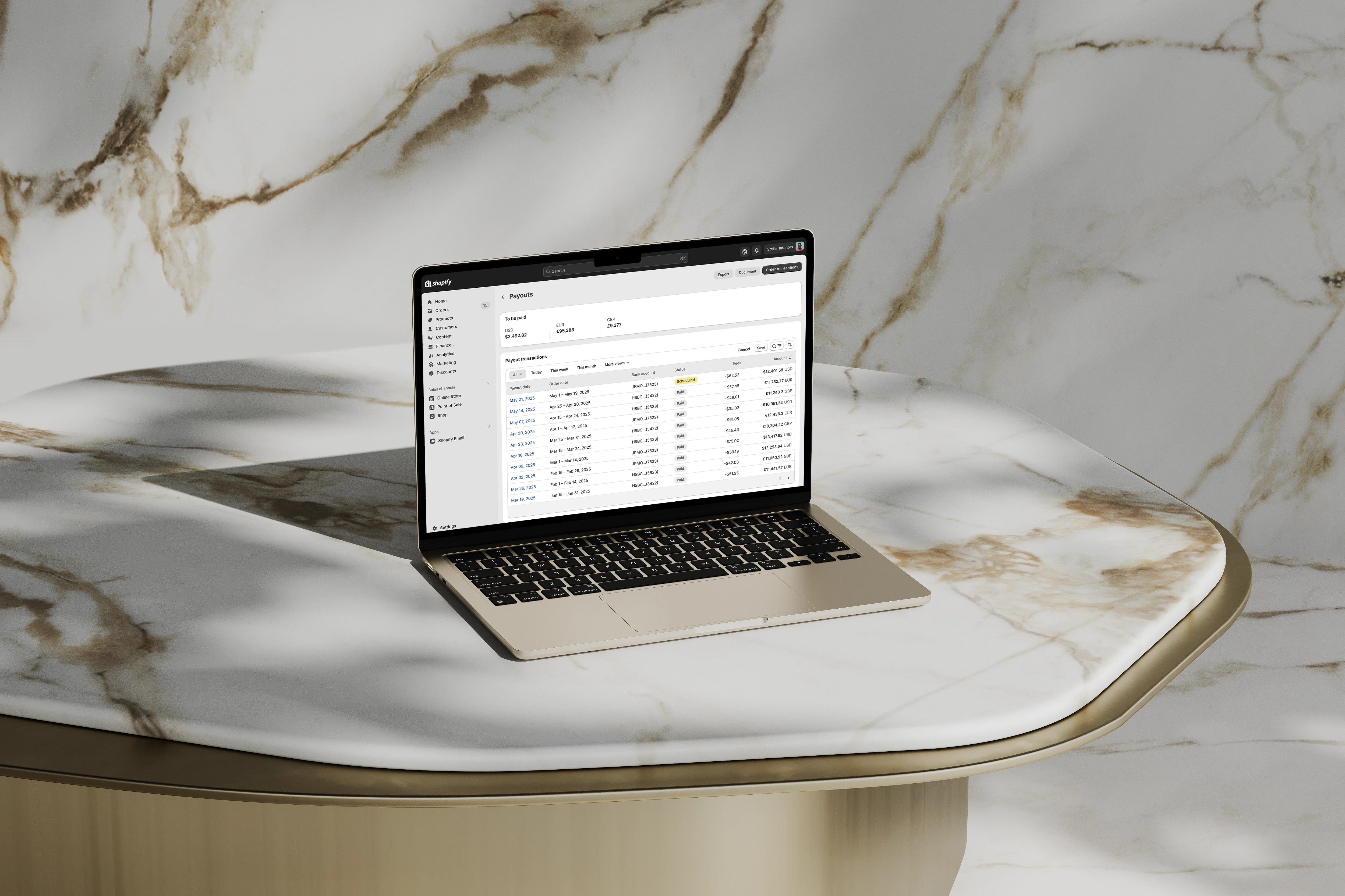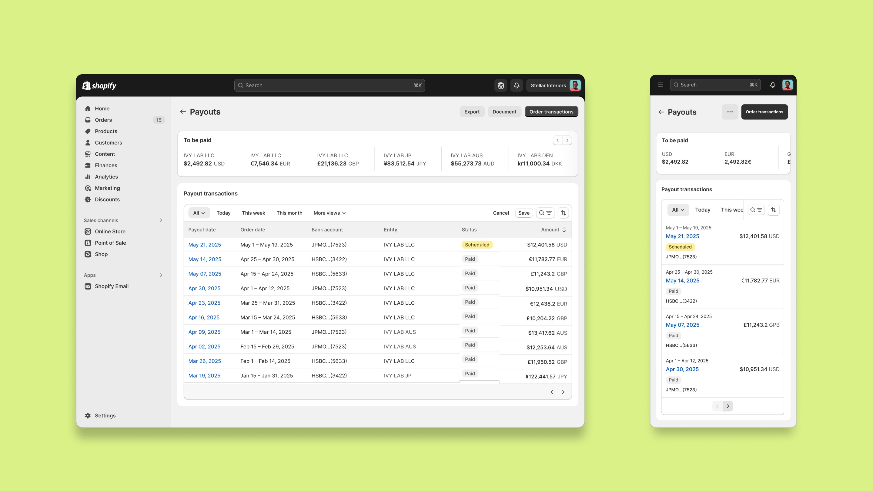 Shopify developers built payouts on the assumption of a single currency and lacked basic features such as transaction filters, bank references, and precise payout timing. I audited flows across providers and mapped the data model to design a coherent framework for entities, currencies, fees, and timelines.